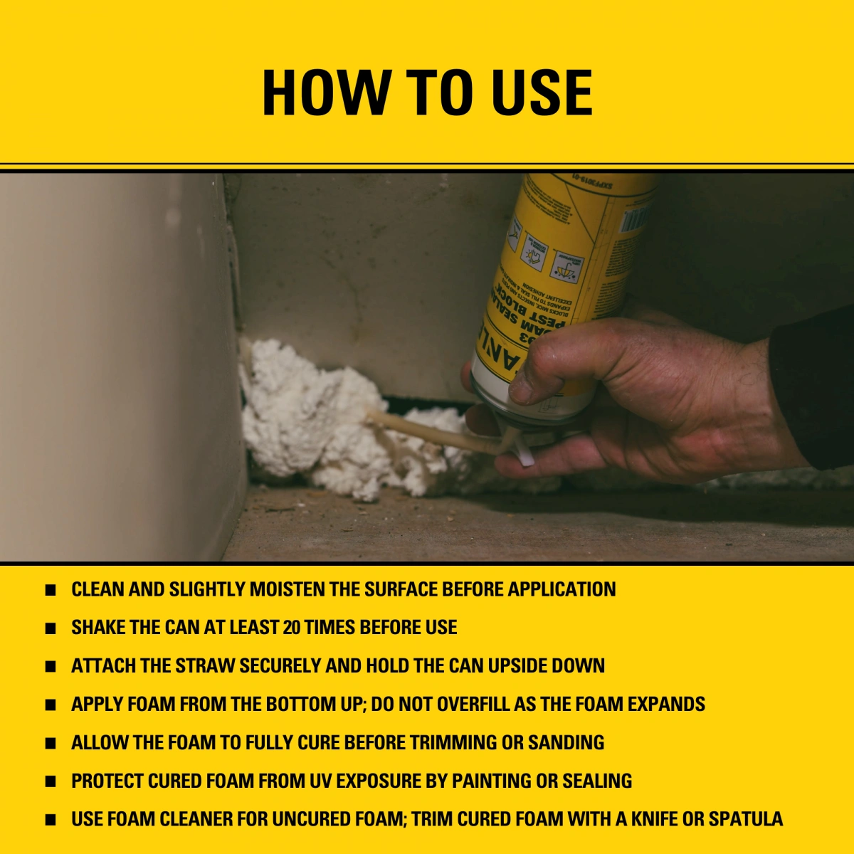 STANLEY F 933 FOAM SEALANT PEST BLOCK ist ein einkomponentiger Polyurethanschaum-Dichtstoff, der ein bei der EPA registriertes Pestizid enthält und den Schaum vor dem Befall durch Mäuse, Vögel, Fledermäuse und Baumhörnchen schützt. Er hält zudem Ameisen, Kakerlaken, Spinnen und Bienen fern. Dieser hochleistungsfähige Polyurethanschaum kann zum Verfüllen von Spalten und Rissen in Garagen, Dachböden, Kriechkellern, Kellern, unter Waschbecken, um Rohrleitungen/Elektrodurchführungen herum oder an allen Stellen verwendet werden, an denen Schädlinge, Insekten oder Zugluft in Ihr Haus und Ihre Wohnräume eindringen können.