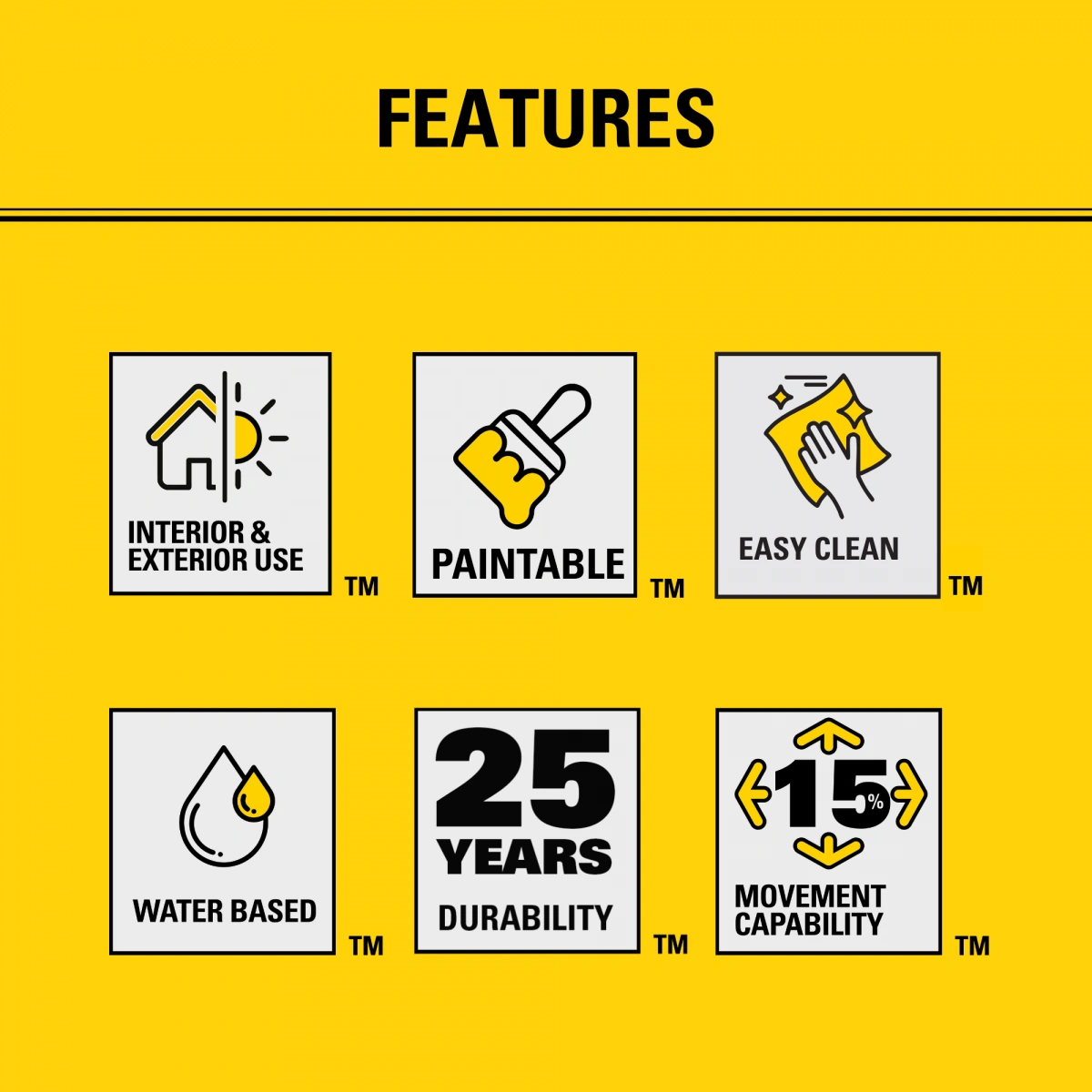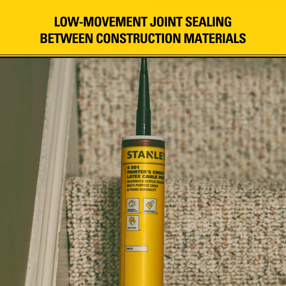 STANLEY S 501 PAINTER’S CHOICE LATEX CAULK PRO ist eine einkomponentige, hochwertige Allzweck-Dichtmasse mit niedrigem Modul, die mit einer Silikonemulsion verstärkt ist und sich zum Abdichten einer Vielzahl unterschiedlicher Bauteile eignet. Sie enthält Silikonadditive für höhere Flexibilität und Haftung sowie eine 100-prozentige Aushärtung. Es ist mit Latex- oder Ölfarben überstreichbar. Es scheint nicht durch und verfärbt die Farbe nicht, was zu hervorragenden Lackierergebnissen führt. Es lässt sich leicht auftragen und verarbeiten, ist geruchsarm und lässt sich leicht mit Wasser reinigen. Es haftet stark auf vielen verschiedenen Untergründen wie: Holz, Aluminium, den meisten Metallen, Vinyl, den meisten Kunststoffen, Glas, Trockenbauwänden, Putz, Ziegel, Stein, Beton, Mörtel, Faserzement, Stuck usw.