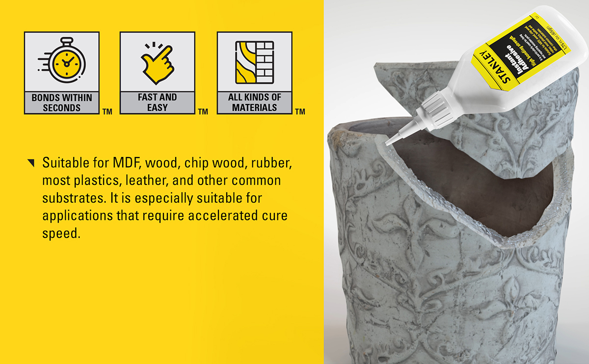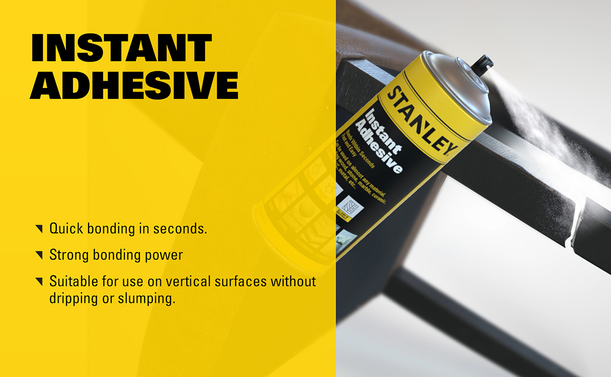 STANLEY A 550 ULTIMATE GRAB INSTANT ADHESIVE KIT is a high-performance adhesive solution, ideal for both professional and DIY applications. The kit includes a high-viscosity cyanoacrylate adhesive and a specialized activator that works together to ensure fast, strong bonding across a wide range of materials. The activator prevents the adhesive from being absorbed by porous surfaces, increasing bond strength and ensuring a more durable hold. With its high viscosity, the adhesive is perfect for use on vertical surfaces, as it won’t drip or slump, allowing for precise and controlled application. The fast-curing formula, enhanced by the activator, is particularly beneficial for applications where rapid bonding is required. Suitable for a variety of materials, including plastics, metals, wood, and ceramics. STANLEY® A 550 Kit is a reliable and efficient solution for quick, long-lasting repairs or projects that demand both speed and strength.