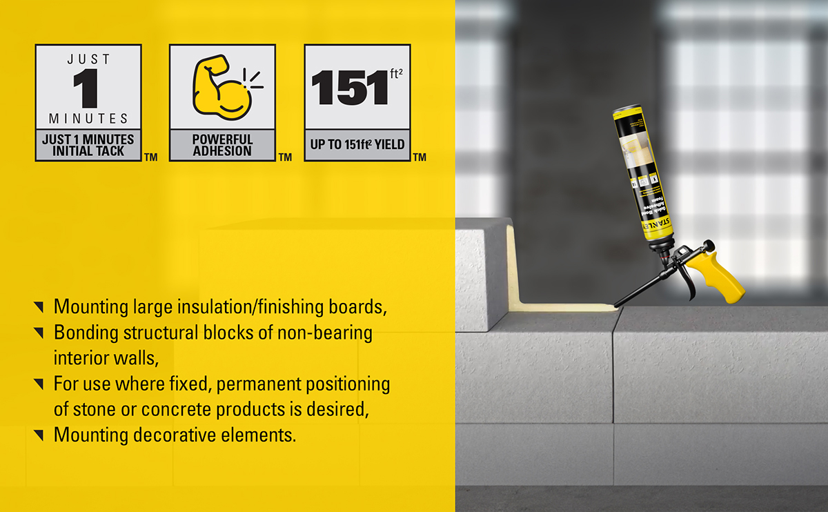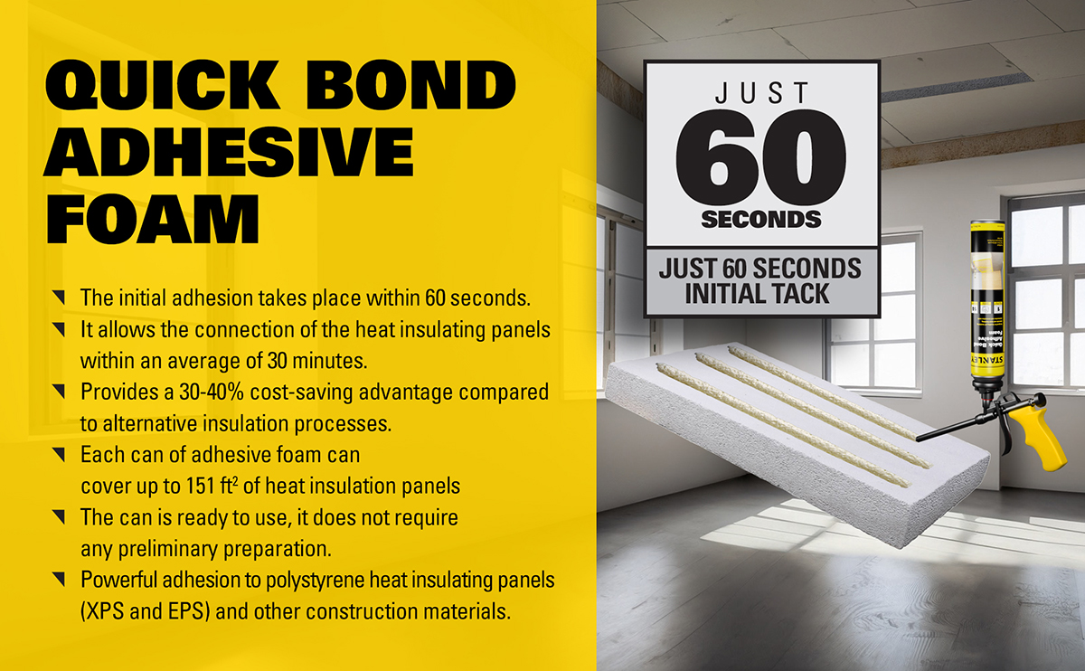 STANLEY FA 192P FOAM ADHESIVE QUICK BOND with its initial tack feature reduce the fasteners needed and ensures a strong bond won’t fade with time. Its low odor, solvent free formula is safe to use with various construction materials, such as: EPS, XPS, ISO Foam Board, mineral wool, metal, wood, brick, stone, gypsum board, rubber, vinyl, PVC and more.