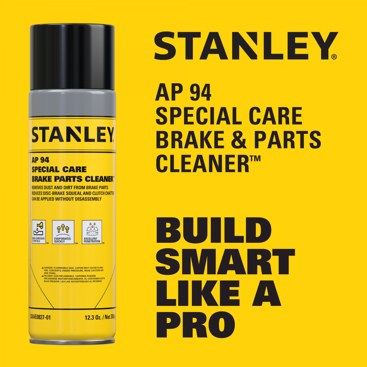 STANLEY AP 94 BRAKE PARTS CLEANER is a high quality, versatile, non-staining and non-corrosive unique formula aerosol spray formulated for rapid and safe removal of brake fluid, grease, oil, dust, and other contaminants on disc brake, brake drum, and brake calipers and clutches. It cleans without the need to disassemble the brake unit. Also helps to stop disc brake squeal and eliminate clutch slippage. Stanley® Brake Parts Cleaner helps brakes stay long-lasting and high performing.