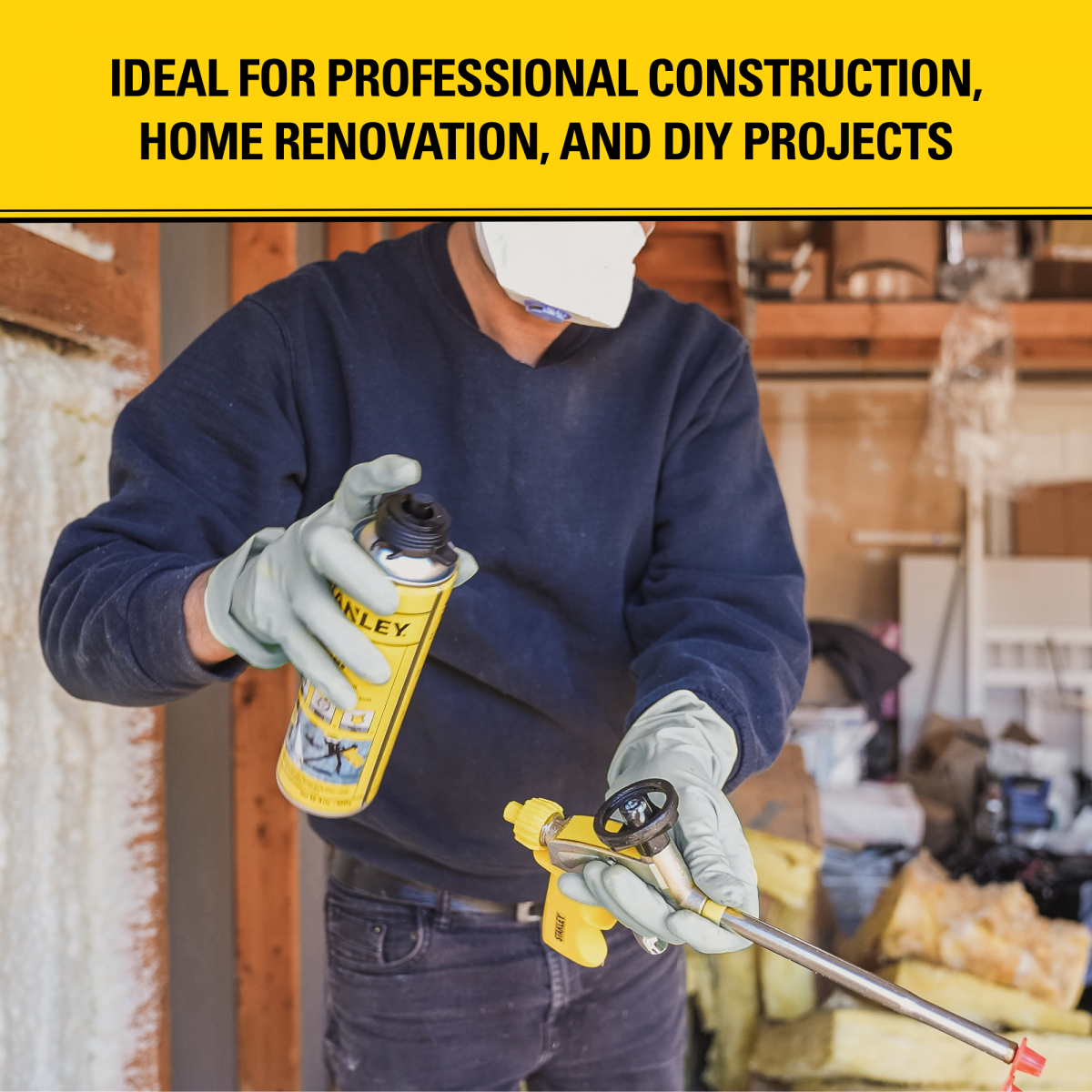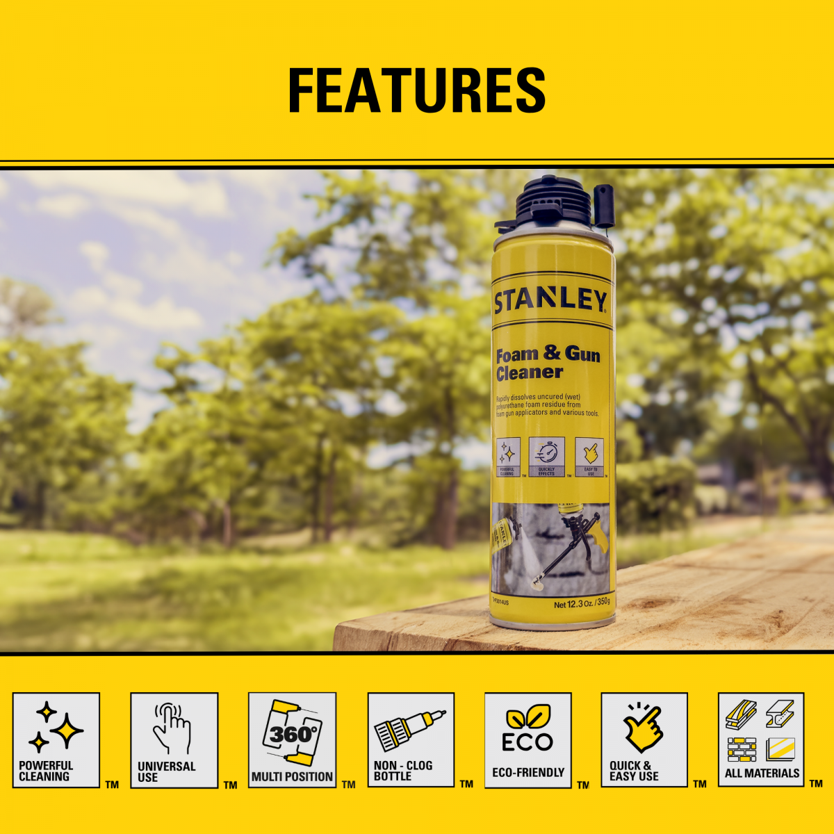 STANLEY T 244 SPECIAL CARE FOAM & GUN CLEANER is a solvent-based strong aerosol cleaner specifically designed for removing fresh polyurethane foam, both from surfaces and the gun adapter used for foam application. It effectively cleans surfaces, clothes, window, and door frames, while preventing fresh foam cured in the gun adapter.