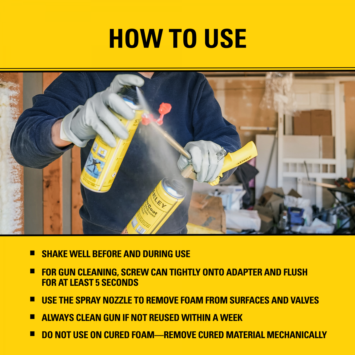 • Gun cleaning: Foam Cleaner is ideal for cleaning the spray gun after using PU foam, ensuring its cleanliness, and preventing clogging.