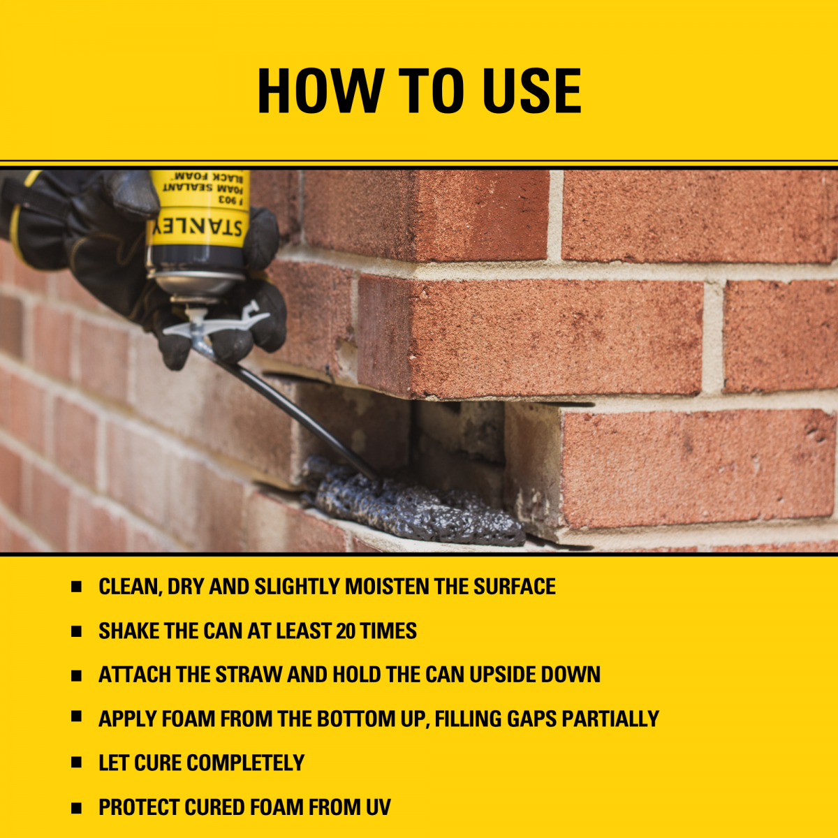 STANLEY F903 FOAM SEALANT BLACK FOAM is a one component, high performance, black-colored, straw use, polyurethane foam sealant designed for landscaping, RV, Automotive, HVAC and other many differen applications. Black Foam has a fast curing formula and bonds quickly to porous and non-porous rock, stone, cement, wood, and various other materials. Perfect deep black color provides UV resistance and blends in naturally to landscape and black piping.