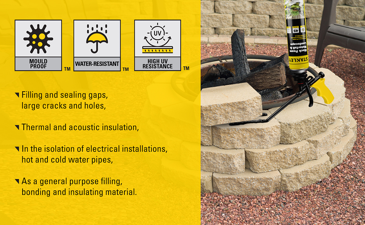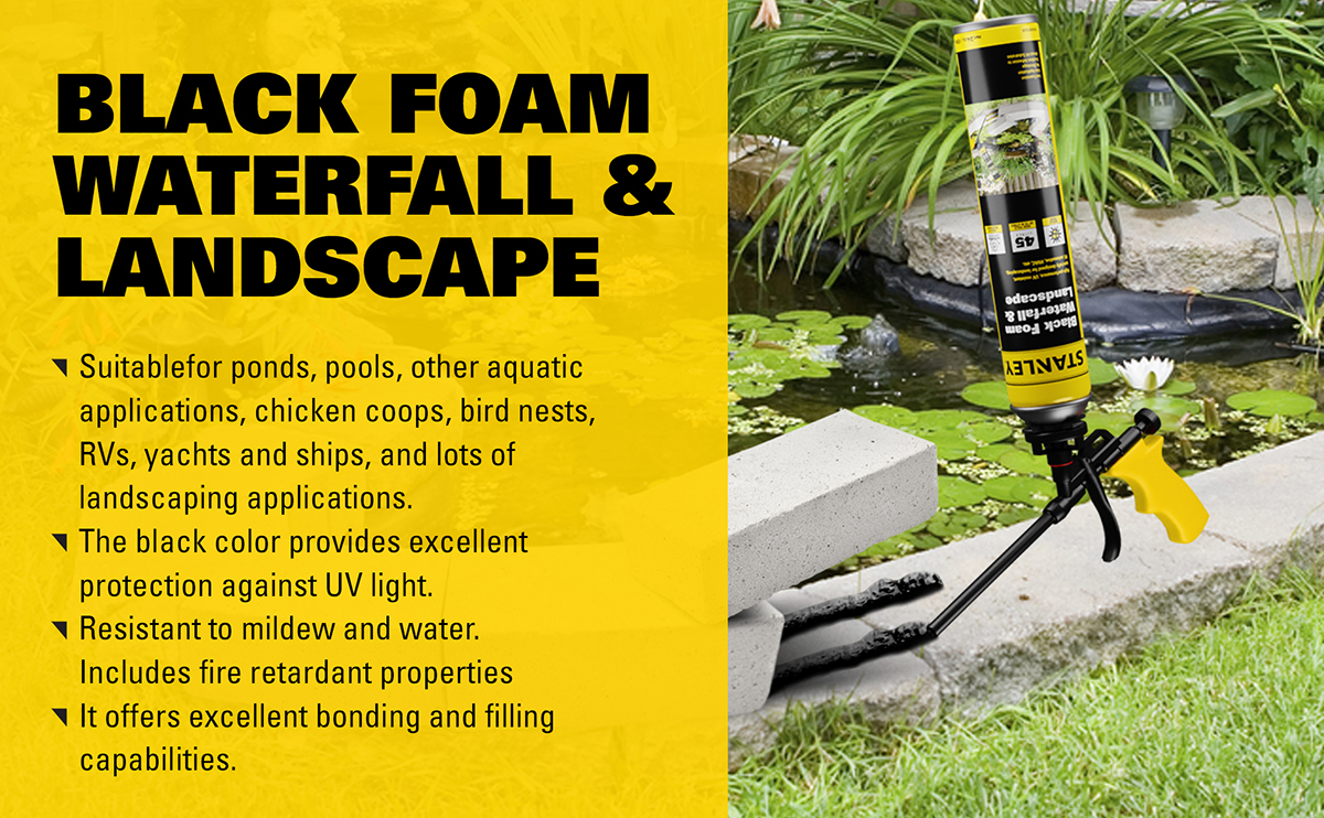 STANLEY F903P FOAM SEALANT BLACK FOAM PRO is a one component, high performance, black-colored, professional gun type polyurethane foam sealant designed for landscaping, RV, Automotive, HVAC and other many different applications. Black Foam has a fast curing formula and bonds quickly to porous and non-porous rock, stone, cement, wood, and various other materials. Perfect deep black color provides UV resistance and blends in naturally to landscape and black piping.