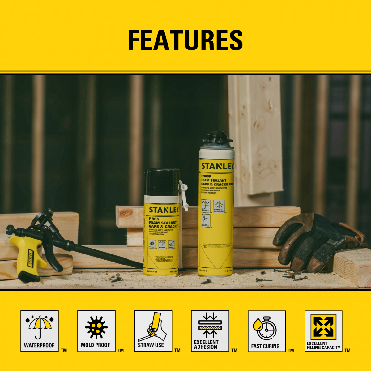 STANLEY F 905 FOAM SEALANT GAPS & CRACK is a one component, moisture curing, polyurethane foam sealant which expands to fill, seal and insulate wider gaps, joints and cavities. It does not contain harmful propellant gasses that can harm the ozone layer. It expands to take the shape of the cracks and forms a long-lasting, airtight and water-resistant seal.