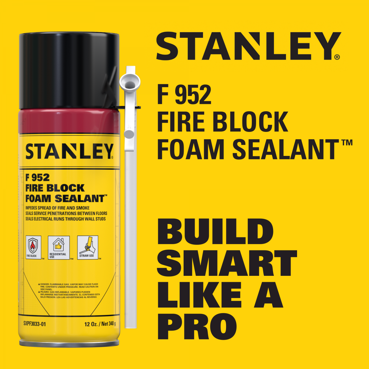 STANLEY F 952 FIRE BLOCK FOAM SEALANT is a one component, all purpose, flame resistant, self-extinguishing polyurethane foam that cures with moisture. It comes with a straw adapter included in each cannister for easy dispensing. This unique formulated polyurethane foam is ideal for HVAC, plumbing and electrical applications. Stanley Fire Block Foam Sealant is in light red color and easily identified by inspectors as an approved fire block penetration sealant.