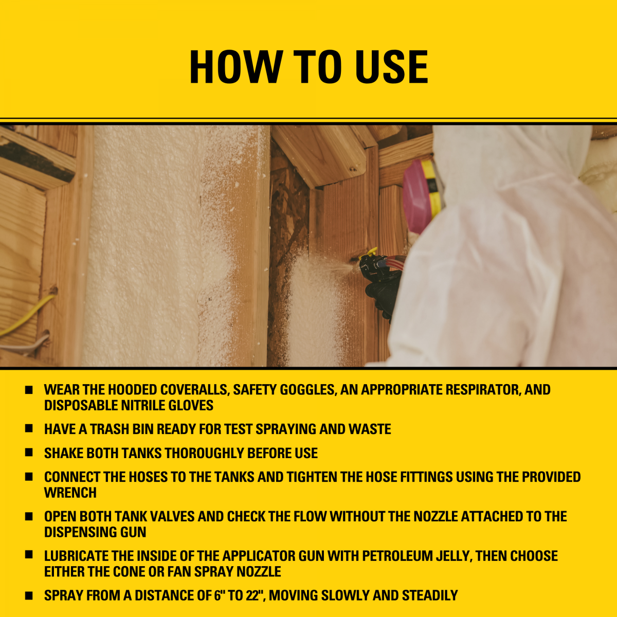 APPLICATION METHOD / TOOLS: Put on protective gloves. Shake the can well before use. Each can come with two special plastic nozzles for spraying on walls and ceilings (refer to Picture 1). Nozzle A is for vertical surfaces, and Nozzle B is for ceilings. Attach the desired nozzle to the applicator gun. Screw the can onto the applicator. Hold the can upside down and activate the foam by pressing the valve. Always handle the canister with the valve pointing downwards. For vertical applications, spray the foam from 12-18 inches from the wall. For horizontal applications on ceilings, spray the foam from a distance of 6-8 inches. The product can be applied to the desired thickness by layering it. Thicker layers provide higher insulation value. For optimal insulation value, it is recommended to reach a thickness of 2 inches with a minimum of 3 layers. Ideal insulation value cannot be achieved with just 1 or 2 layers. Moisturizing the surfaces and the foam improves adhesion and shortens curing time. Fill vertical gaps with foam, starting from the bottom and moving up. Avoid filling the entire gap, as the foam will expand in volume.